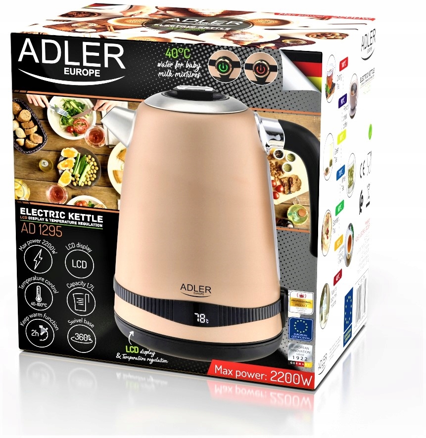 Czajnik wyposażony jest w wygodną, zdejmowaną pokrywę, co ułatwia czyszczenie i nalewanie wody. Centralny styk pozwala na obracanie podstawy o 360°, dzięki czemu czajnik można obsługiwać jedną ręką. Nowoczesny wyświetlacz LED informuje o temperaturze, a sygnał dźwiękowy sygnalizuje rozpoczęcie i zakończenie gotowania wody.