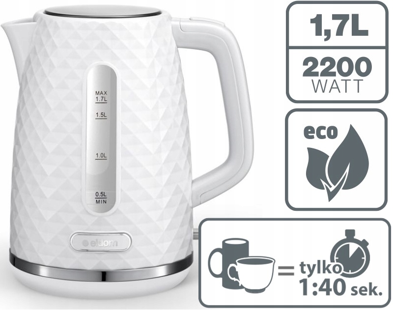 Elegancki czajnik elektryczny 2200W biały 1,7L z filtrem i wskaźnikiem poziomu wody