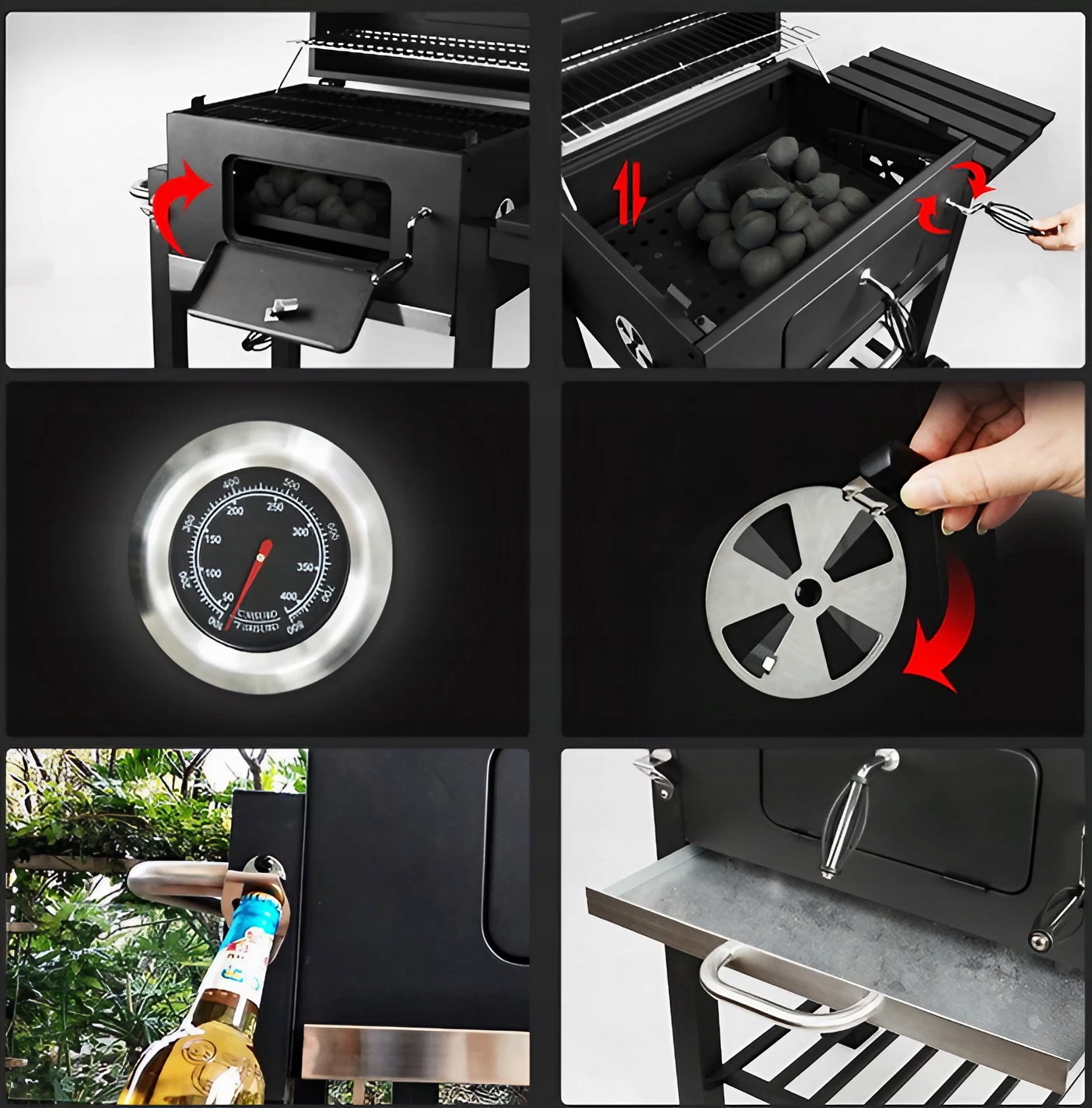 Dzięki otwieranym drzwiczkom łatwo można rozgarnąć żar lub też go przemieszać bez konieczności zdejmowania rusztu co w momencie gdy jest on pełny jest bardzo problematyczne gdyż wiązałoby się to z zdejmowaniem wszystkiego z rusztu.