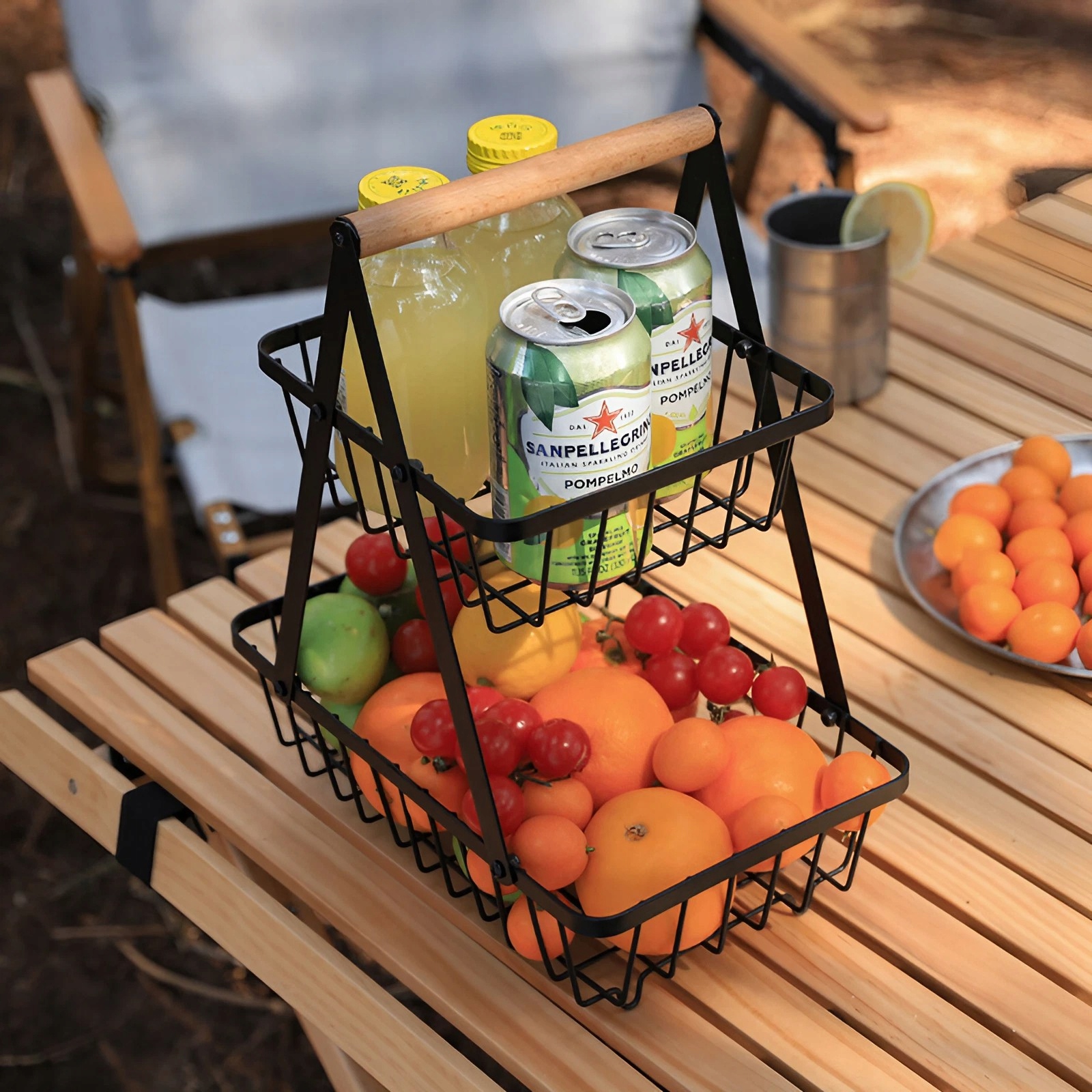 Koszyk Dwupoziomowy na Owoce – Czarny Metalowy z Drewnianą Rączką, Styl Loft