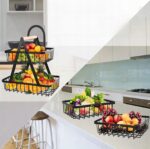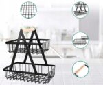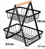Koszyk Dwupoziomowy na Owoce – Czarny Metalowy z Drewnianą Rączką, Styl Loft