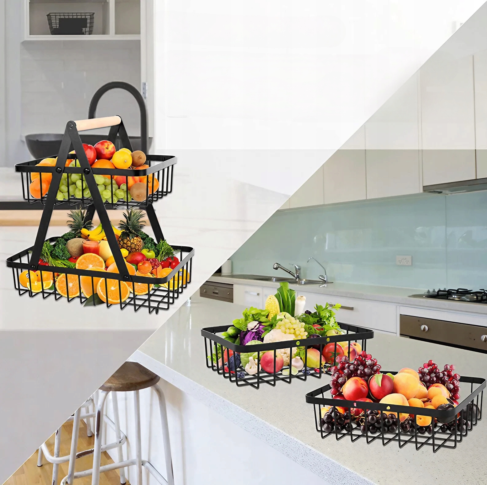 Elegancki, funkcjonalny koszyk dwupoziomowy na owoce, warzywa, jajka lub drobne przedmioty. Idealny dodatek do kuchni, jadalni czy salonu, który łączy styl loftowy z praktycznością.