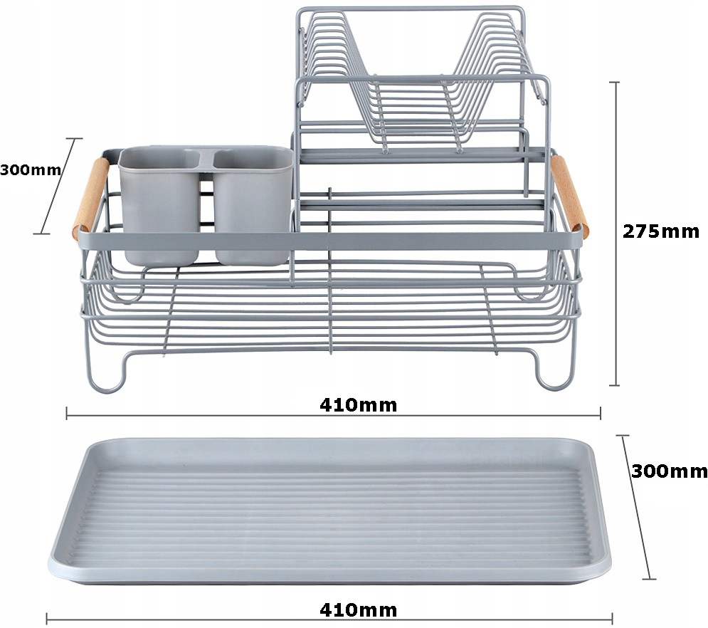 Suszarka do naczyń w szarym kolorze to stylowe i funkcjonalne rozwiązanie do każdej kuchni. Dwupoziomowa konstrukcja oszczędza miejsce, umożliwiając jednoczesne suszenie talerzy, misek, kubków oraz sztućców. Trwała, metalowa rama, malowana proszkowo i wyposażona w drewniane rączki, zapewnia odporność na rdzę i zarysowania. Plastikowy, dwukomorowy ociekacz na sztućce oraz tacka z żywicy skutecznie chronią blat przed wodą. Wymiary 41 x 30 x 27,5 cm umożliwiają wygodne rozmieszczenie naczyń i szybkie ich wysuszenie.
