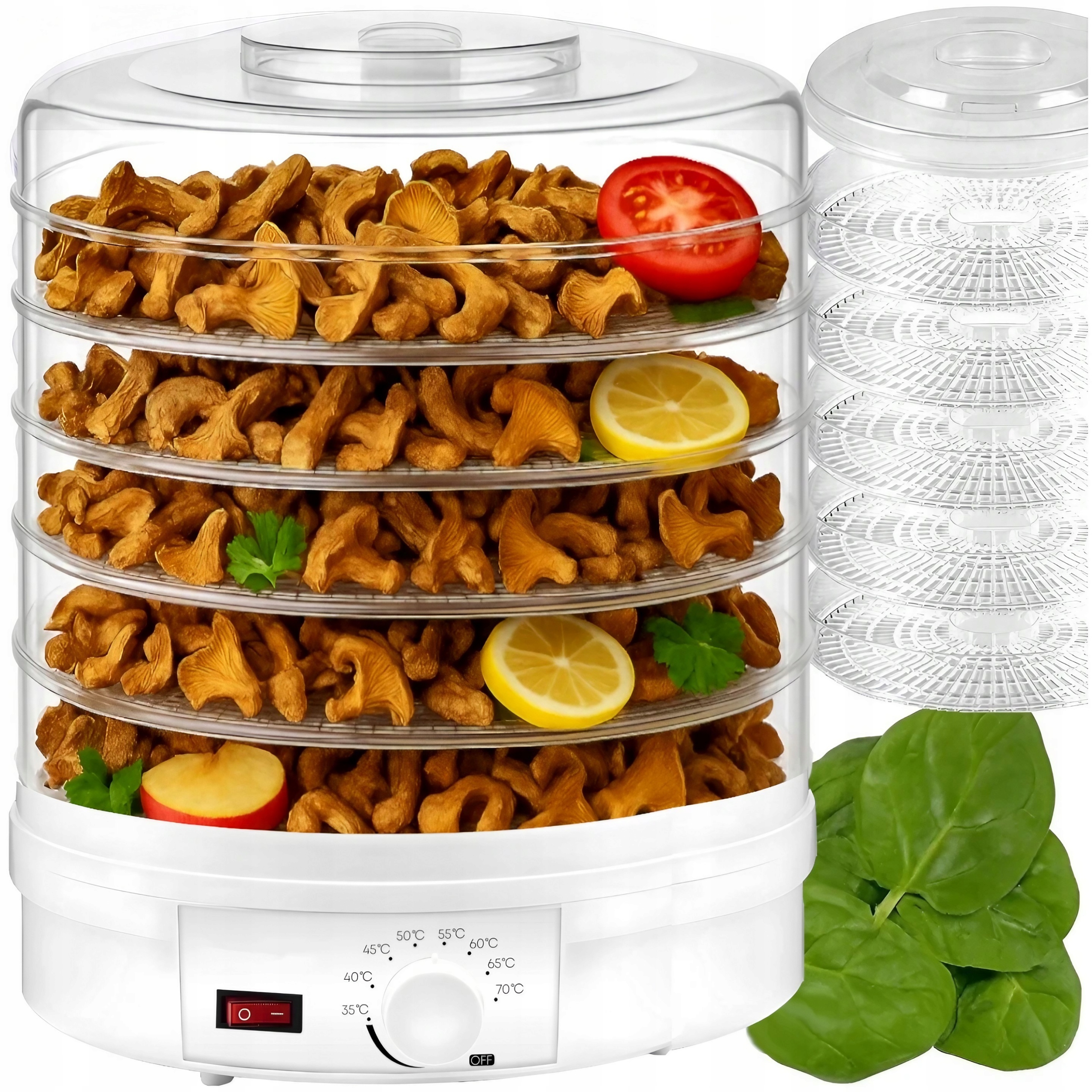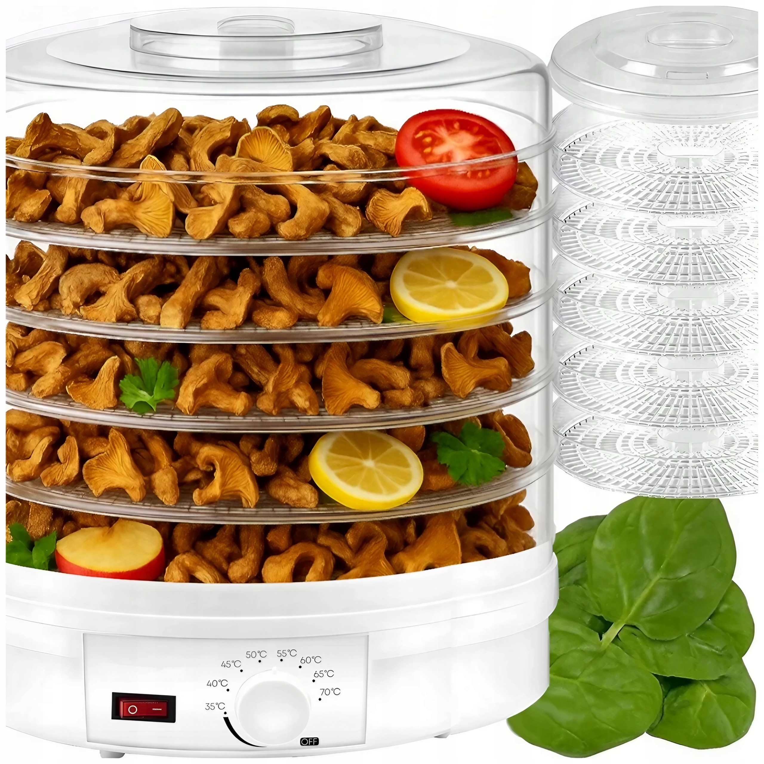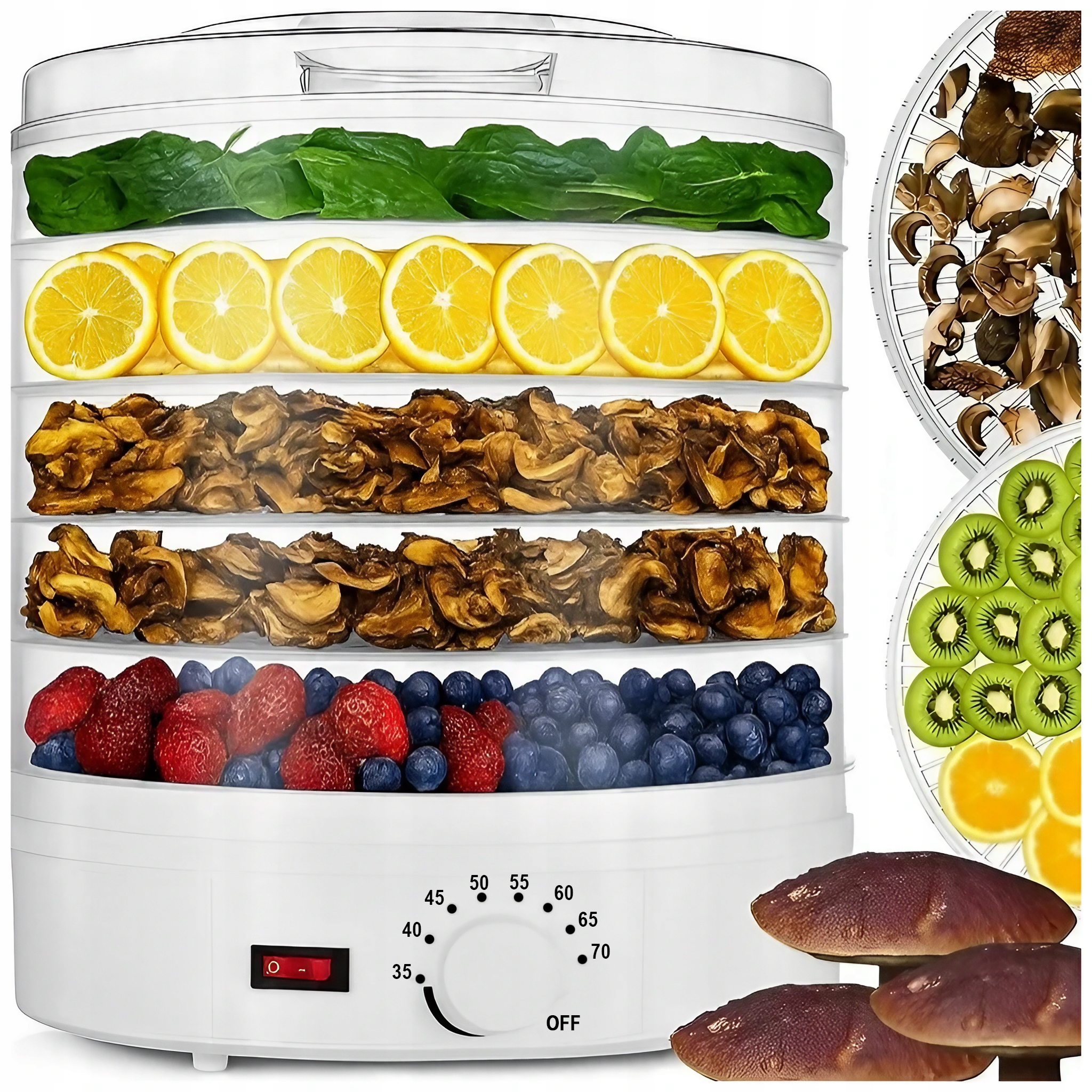 - Dzięki szerokiemu zakresowi temperatur od 35 do 70 °C możesz idealnie dopasować proces suszenia do rodzaju produktu. Niższe temperatury świetnie sprawdzą się przy delikatnych ziołach czy owocach, a wyższe przy grzybach, warzywach czy mięsie.