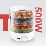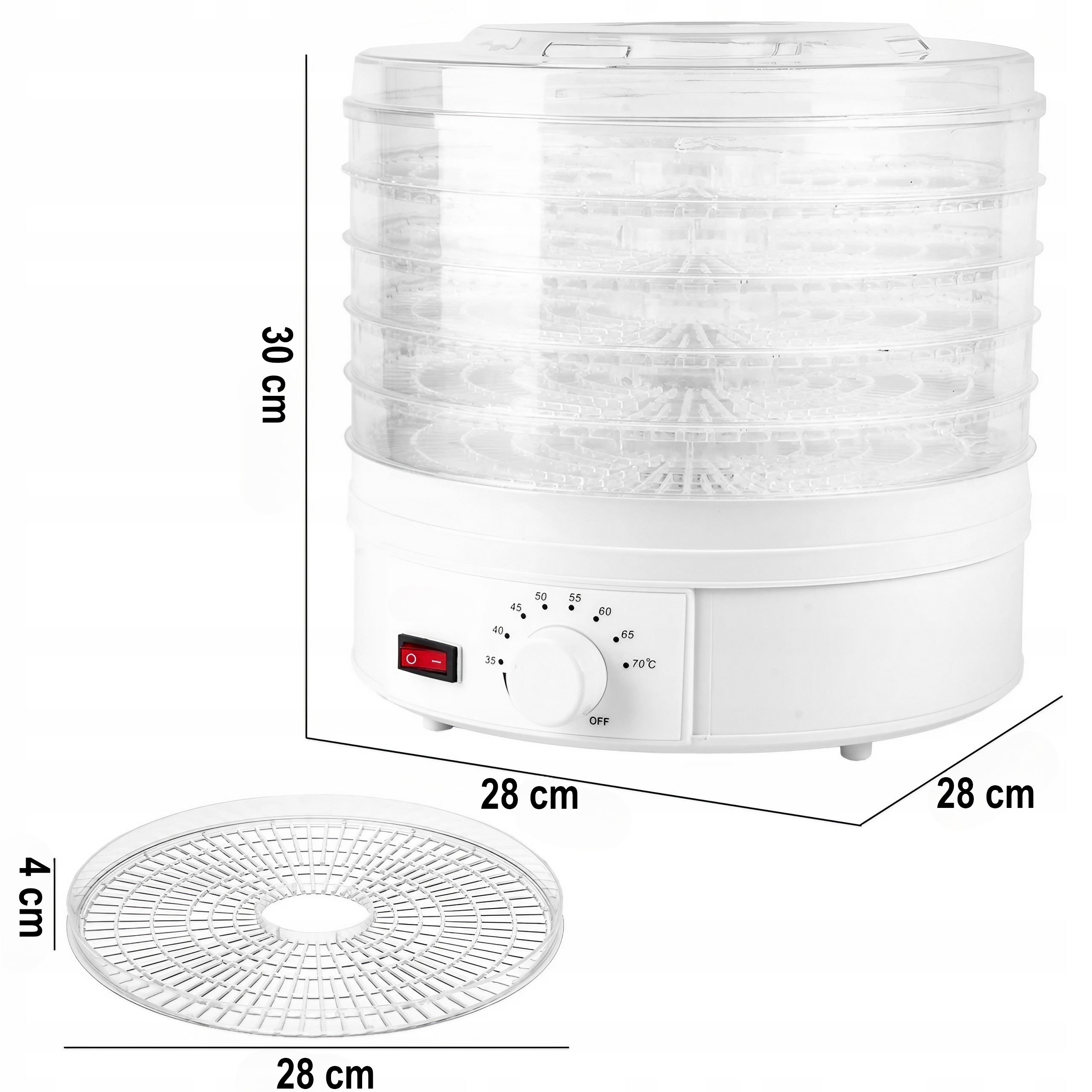 - Sześć przestronnych sit o średnicy 28 cm i wysokości 4 cm zapewnia dużą powierzchnię suszenia przy zachowaniu optymalnej cyrkulacji powietrza. Możesz jednocześnie przygotować spore porcje owoców, warzyw, grzybów czy ziół, a każdy poziom wyschnie równomiernie, zachowując naturalny smak i aromat.