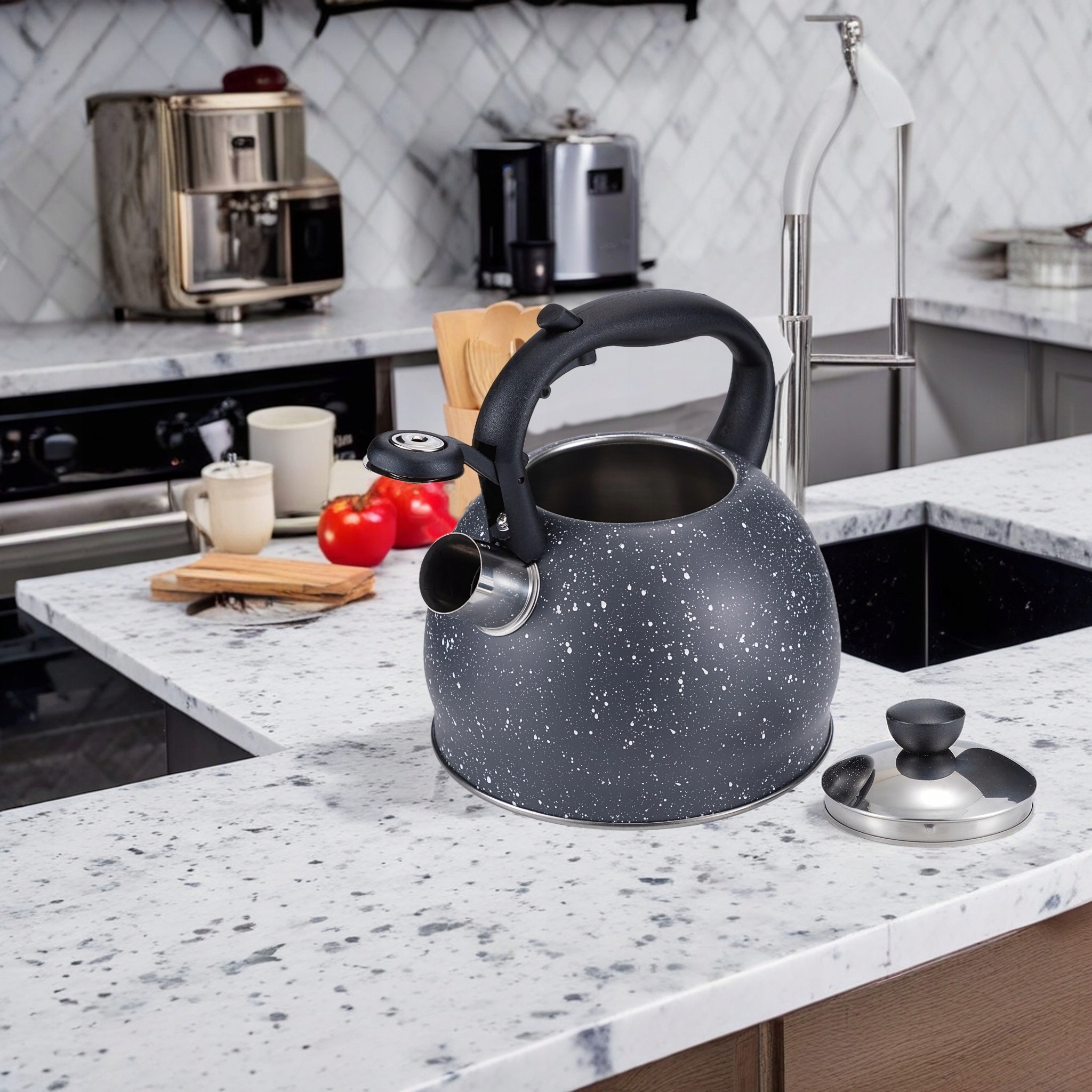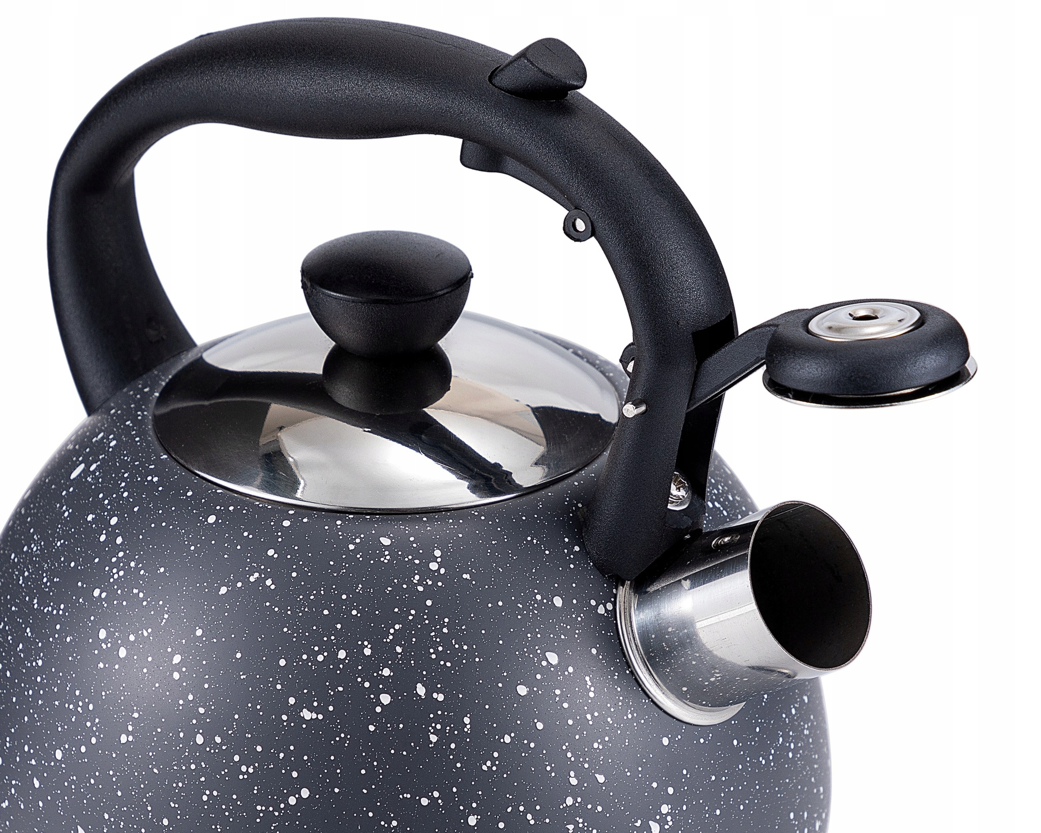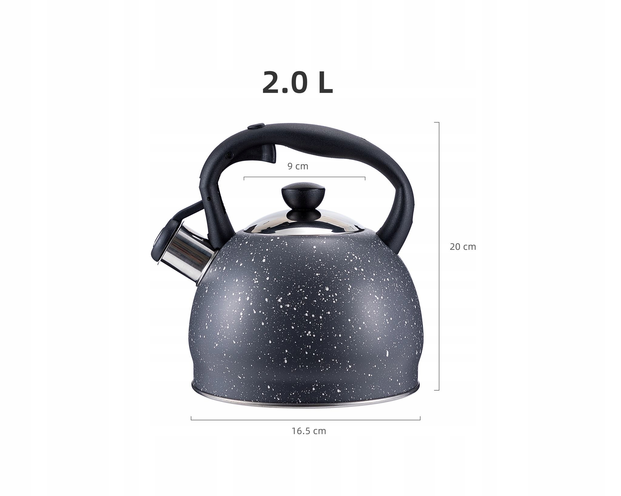 Szary marmurkowy czajnik na gaz i indukcję Elitehoff to elegancki, klasyczny model o pojemności 2 litrów, wykonany z najwyższej jakości stali nierdzewnej. Dzięki indukcyjnemu dnu czajnik szybko się nagrzewa, a jego ciepło jest długo utrzymywane, co pozwala zaoszczędzić czas i energię. Czajnik jest idealny do kuchenek gazowych, indukcyjnych, elektrycznych oraz ceramicznych. Odchylany gwizdek z mechanizmem w rączce chroni przed poparzeniem, a zdejmowana pokrywka zapewnia wygodne napełnianie wodą.